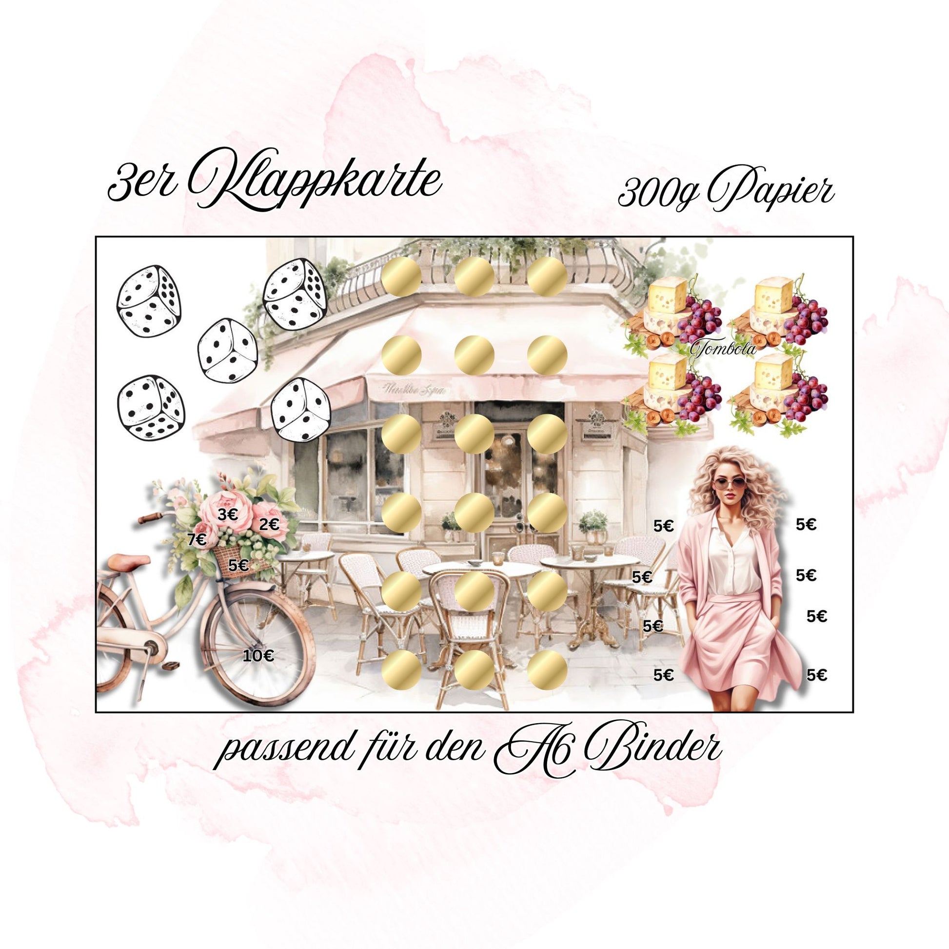 In "Paris" kannst du wundervolle Sachen erleben, spare dafür mit dieser wunderschönen Klappkarte in der du rubbeln, abstreichen und auch Würfeln kannst.