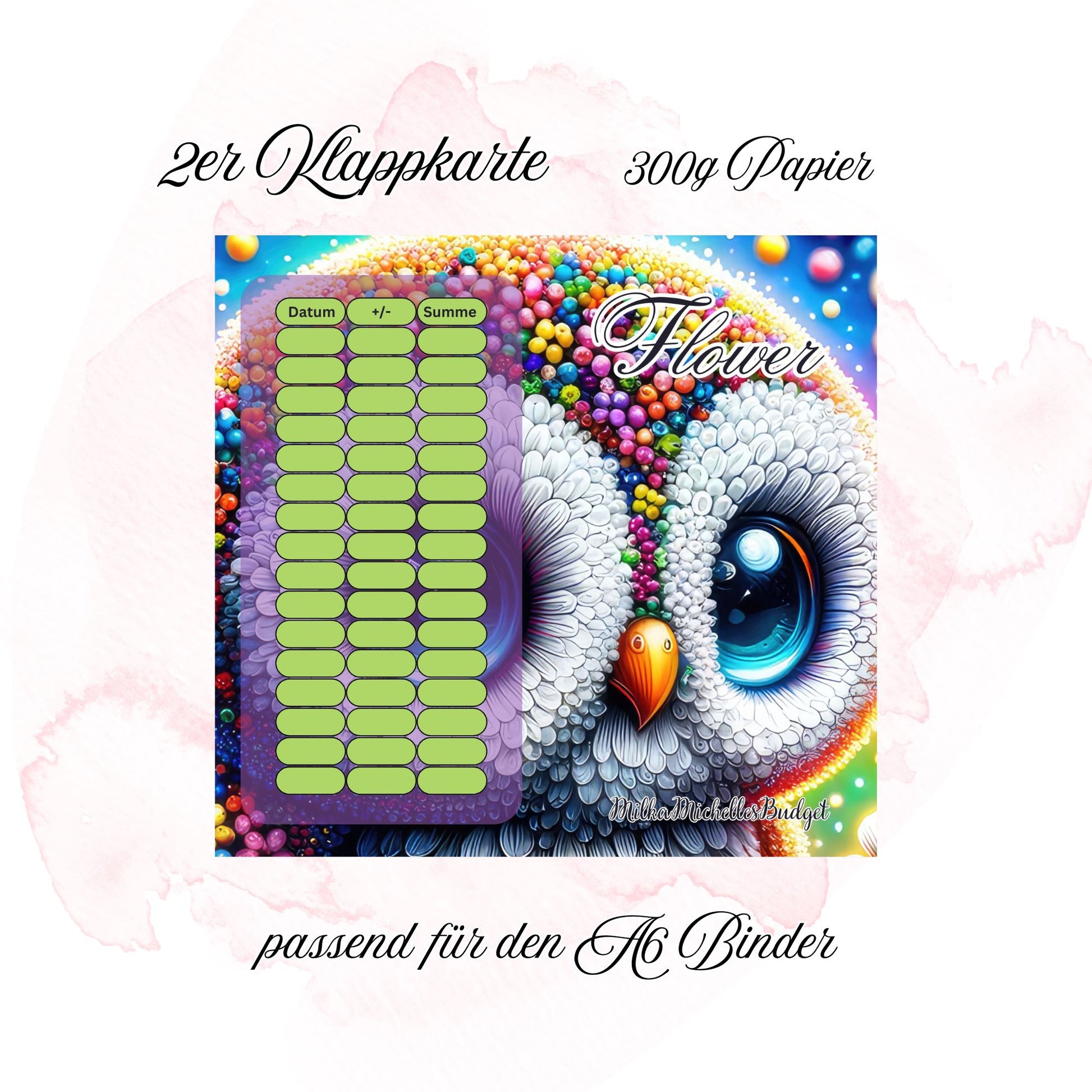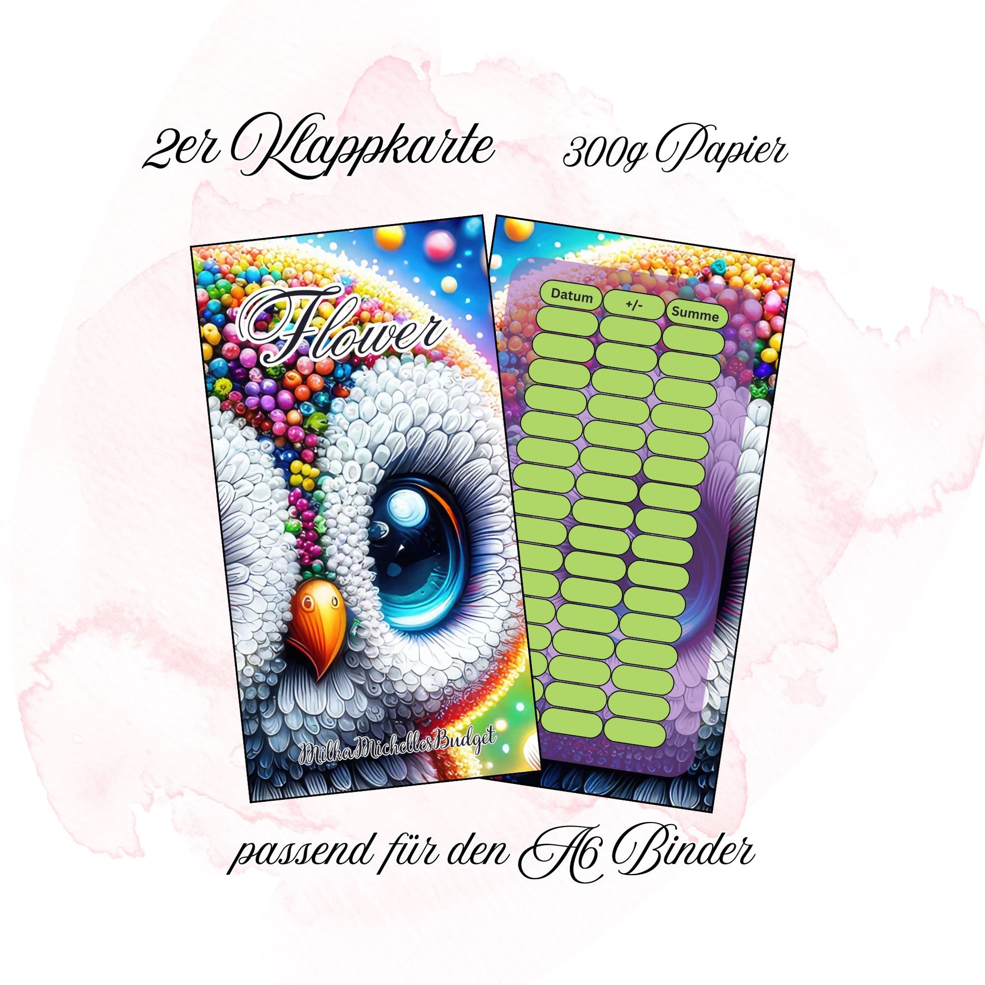 Flower ist eine Klappkarte mit der ihr 415€+? sparen könnte, die Beträge sind zwischen 1€ und 10€. Ihr könnt Abstreichen, Lose ziehen und Würfeln.