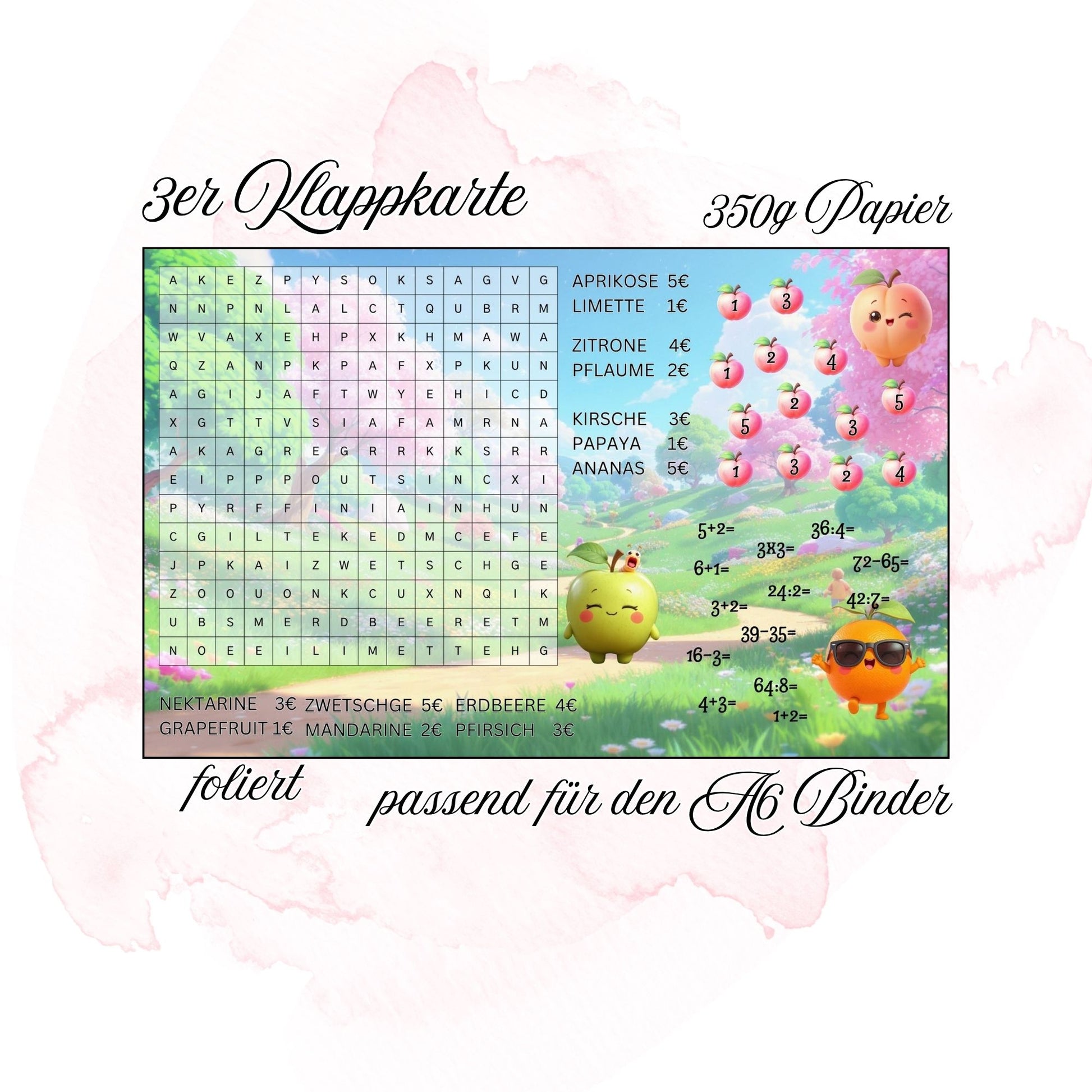 Es warten Abstreichfelder, kleine Rechenaufgaben, eine Wortsuche, Lose ziehen, Rubbelspaß und Würfeln mit einem Würfel deiner Wahl.