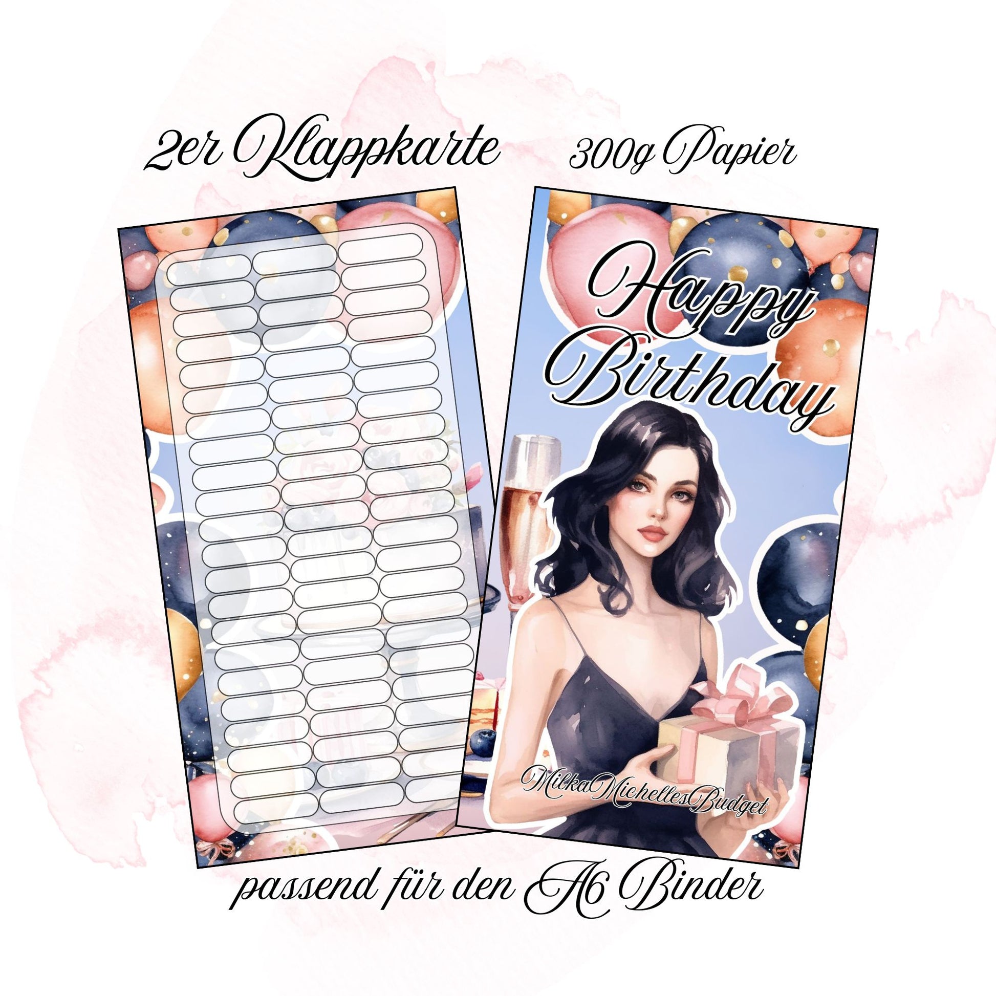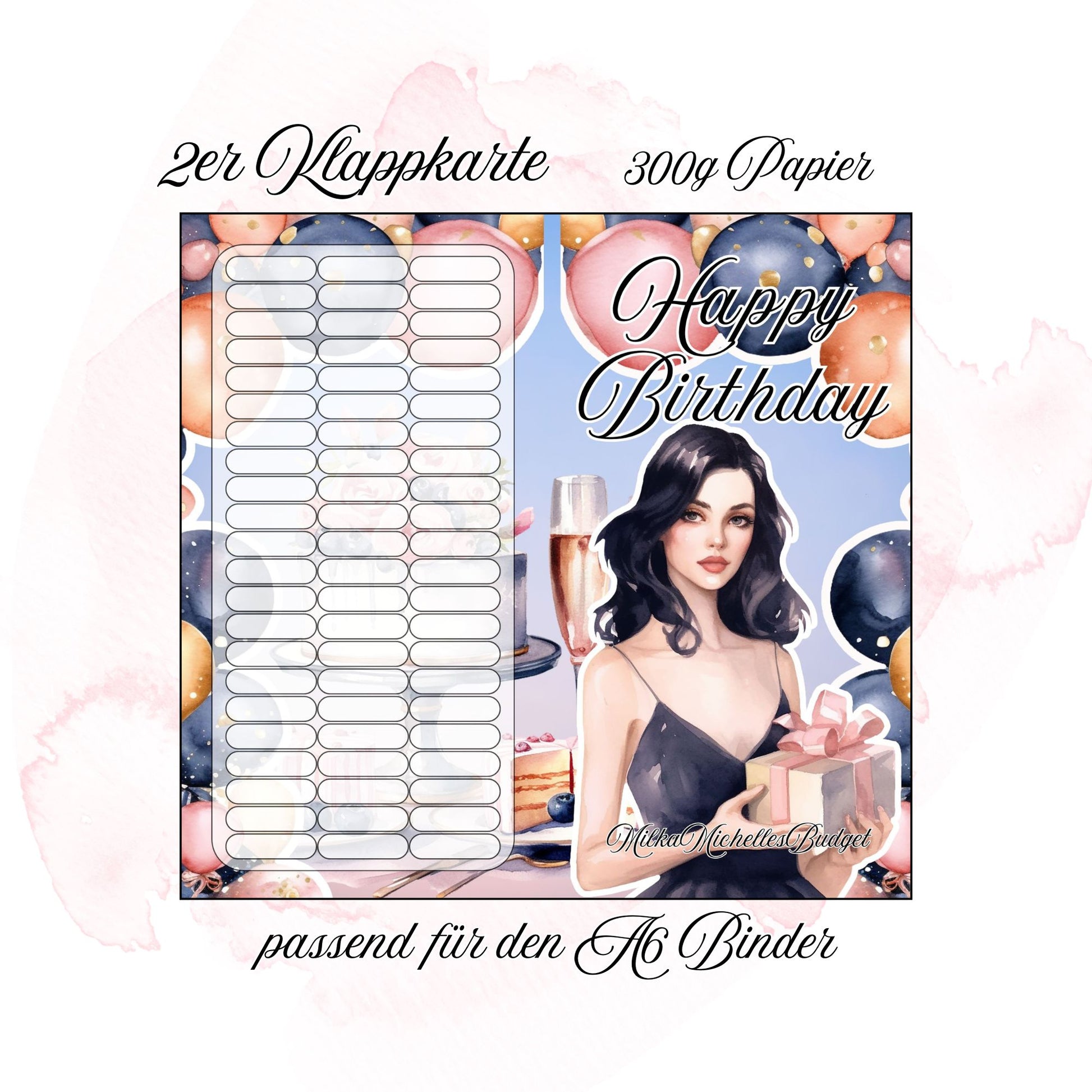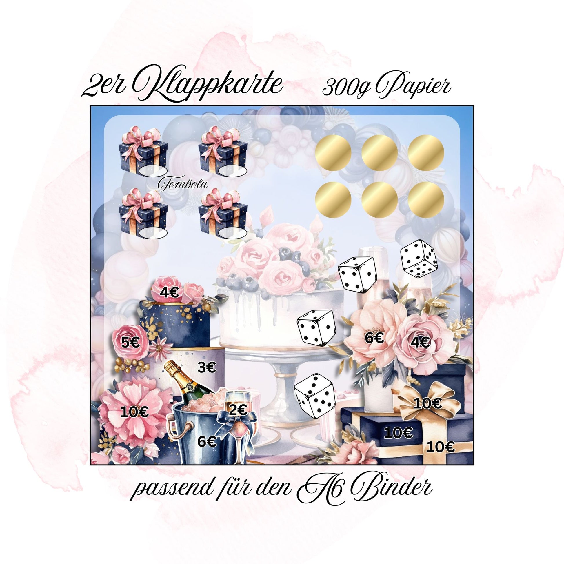 Happy Birthday ist eine 2er Klappkarte in der gerubbelt, gewürfelt, Lose gezogen und abgestrichen wird. Der Höchstbetrag liegt bei 9€.