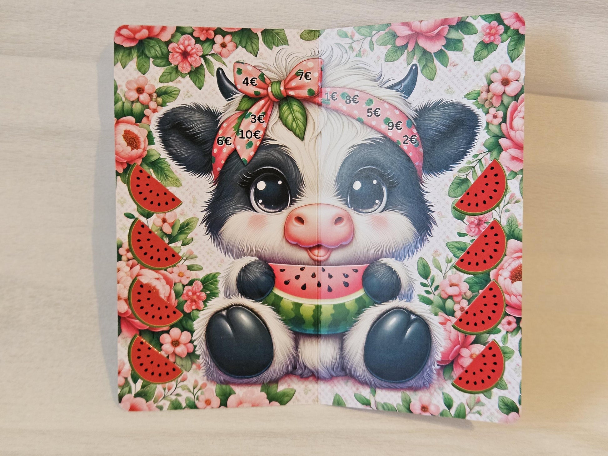 eine Klappkarte mit der Melonen Liebenden Milchkuh, hier hast du die Möglichkeit Abzustreichen und die Melonenhälften aufzurubbeln. Der Gesamtbetrag ist 93€, unter den Rubbel Stickern sind die Beträge zwischen 1€ und 10€.